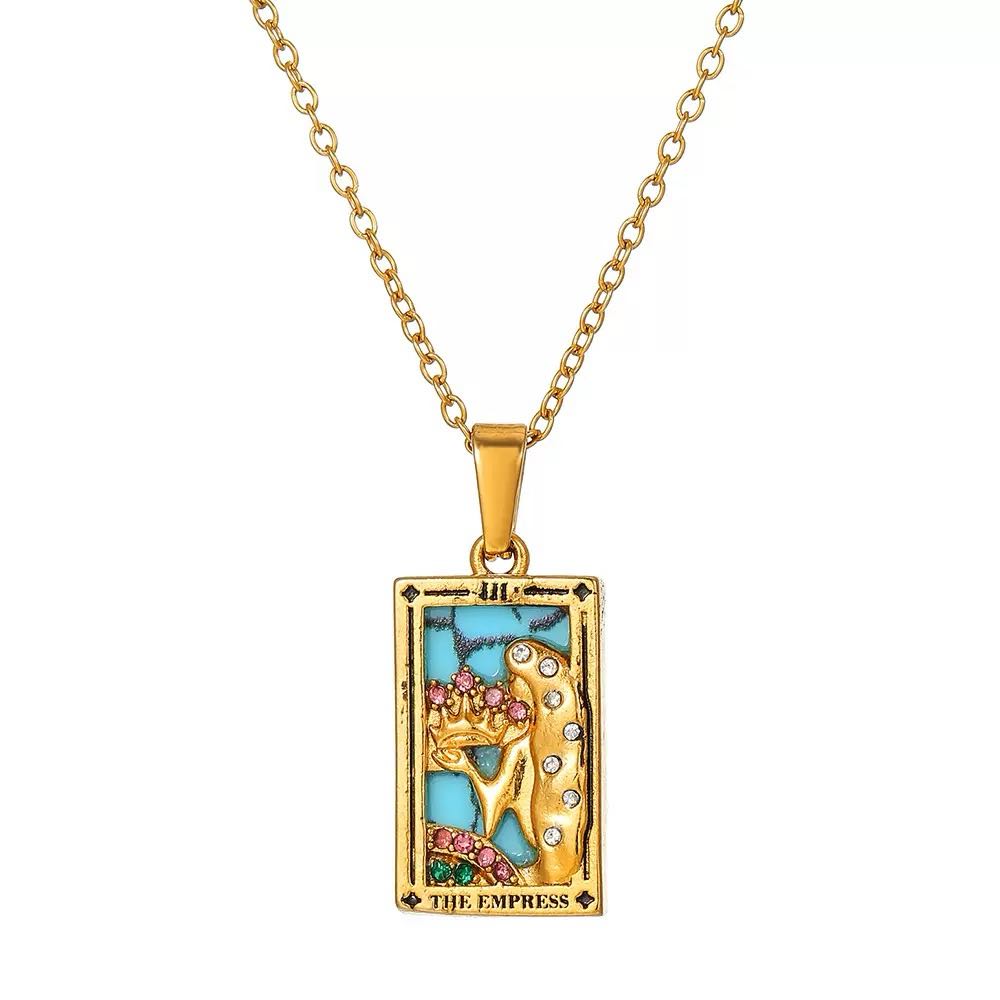 - Crafted with premium gold-plated titanium chain and mini tarot card pendant with zircon accent